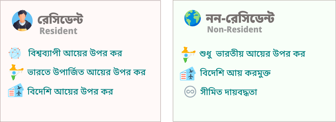 • রেসিডেন্ট (Resident): আপনি যদি রেসিডেন্ট হন, তাহলে আপনাকে আপনার সমস্ত বিশ্বব্যাপী আয়ের (Global Income) উপর ভারতে কর দিতে হবে। অর্থাৎ, ভারতে যা আয় হচ্ছে সেটা তো দিতেই হবে, সাথে বিদেশ থেকে যে বেতন, ব্যবসার লাভভাগ বা অন্য কোনো আয় হচ্ছে, সেটার উপরও কর দিতে হবে।